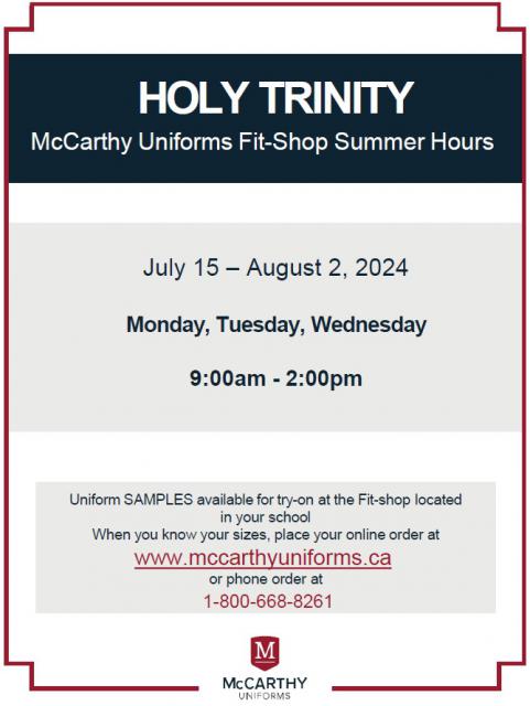Our uniform supplier, McCarthy's, is also the supplier for all phys ed clothing at Holy Trinity. At this time, all orders are to be made online. Please see the McCarthy's website to place your order.